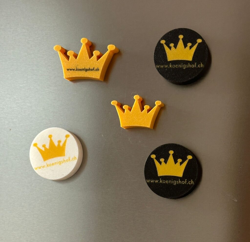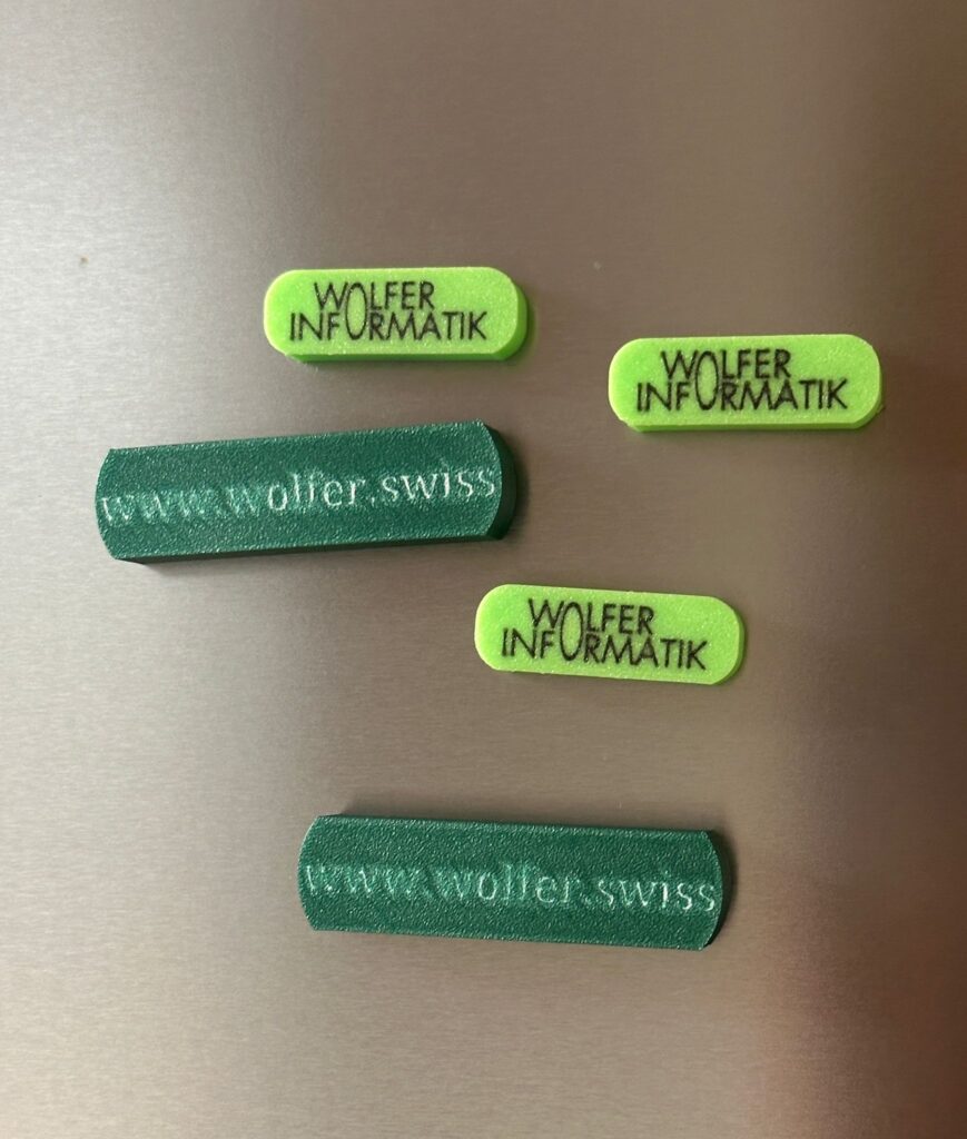 Mit der Multicolor 3D-Drucktechnologie können wir massgeschneiderte Werbeartikel in Kleinserien herstellen, die perfekt auf Ihre Marke und Ihre Botschaft abgestimmt sind. Ob klassische Streuartikel wie Magnete, Schlüsselanhänger oder innovative Ideen wie 3D-gedruckte Visitenkarten – die Möglichkeiten sind nahezu unbegrenzt. Sie haben die Freiheit, einzigartige Formen, personalisierte Designs und sogar komplexe Geometrien zu realisieren, die mit herkömmlichen Methoden schwer umsetzbar wären.